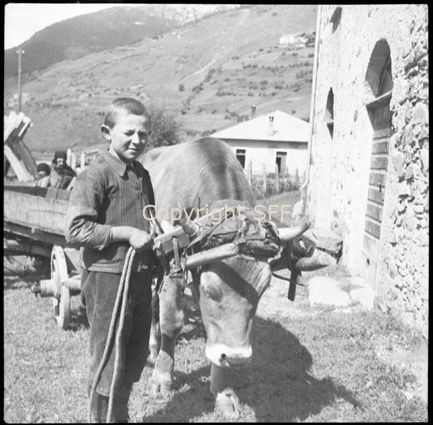 Bovino aggiogato trattenuto da un ragazzo: gioghetto ripreso di fronte