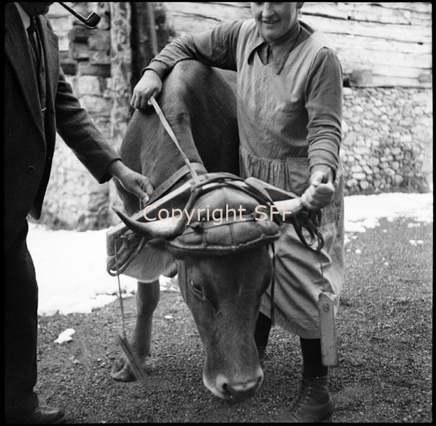 Bovino aggiogato trattenuto da una donna: particolare del giogo