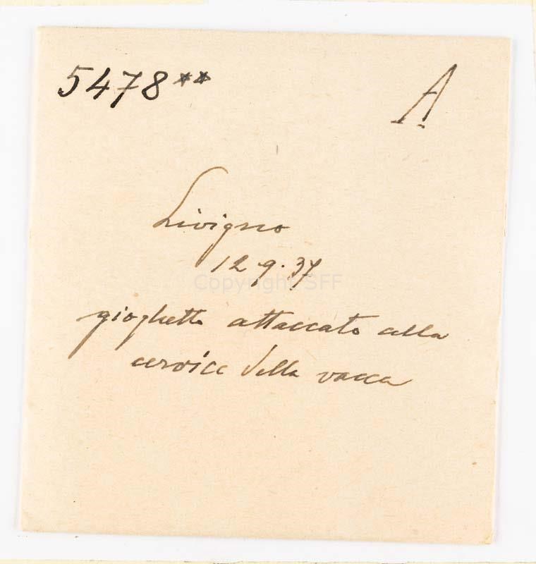 Bovino aggiogato trattenuto da una donna: particolare del giogo