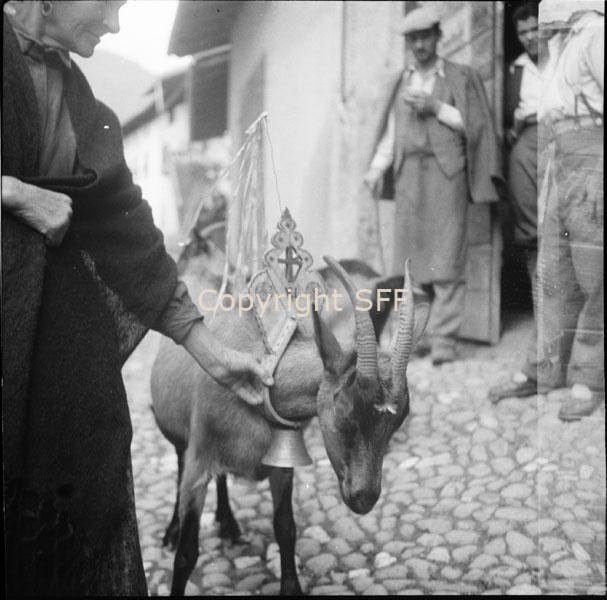 Capra con collare speciale decorato, di ritorno dalla montagna