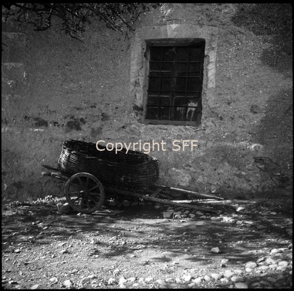 Carro da carico a due ruote; sul piano di carico cestone utilizzato per il trasporto di diversi materiali