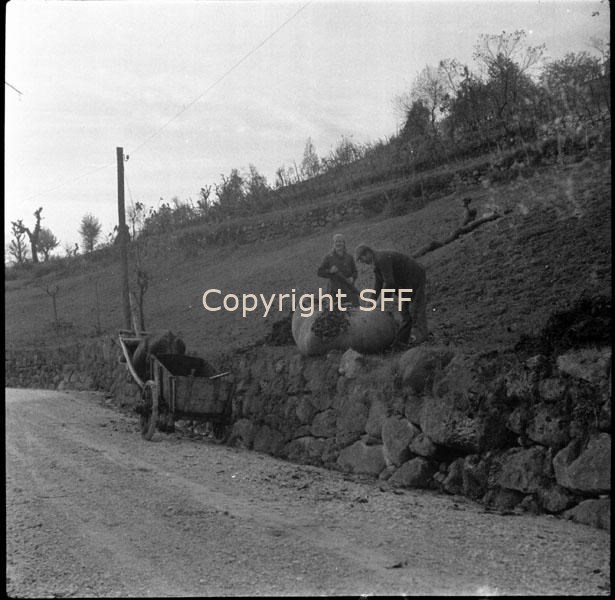 Carretto da letame e lenzuolo da fogliame: contadini al lavoro