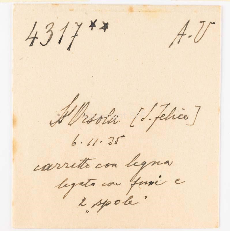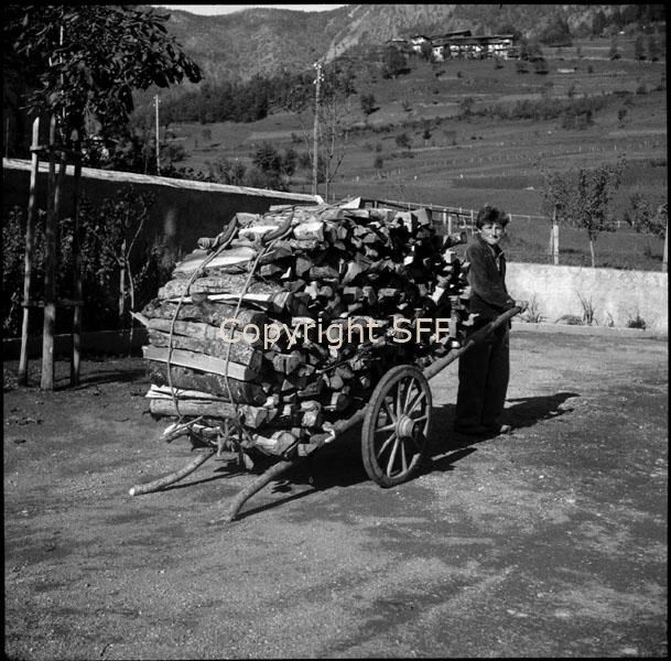 Carretto da carico a due ruote; il legname è agganciato al piano da carico con funi che terminano con particolari spole