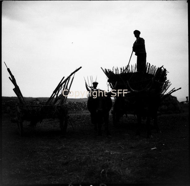 - Carri da carico a due ruote; quello a sinistra ha sponde laterali aggiunte, quello a destra è munito di un cestone (cerda) costruito con materiale vegetale, di solito canna o giunco, utilizzato come contenitore per diversi tipi di carico