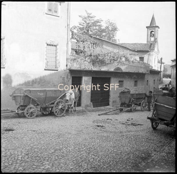 - Carri da carico a quattro ruote trainati da buoi; sul piano di carico contenitore in legno di forma trapezoidale