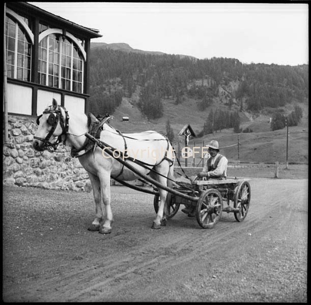 Carro a trazione animale condotto da un uomo: cavallo con collare