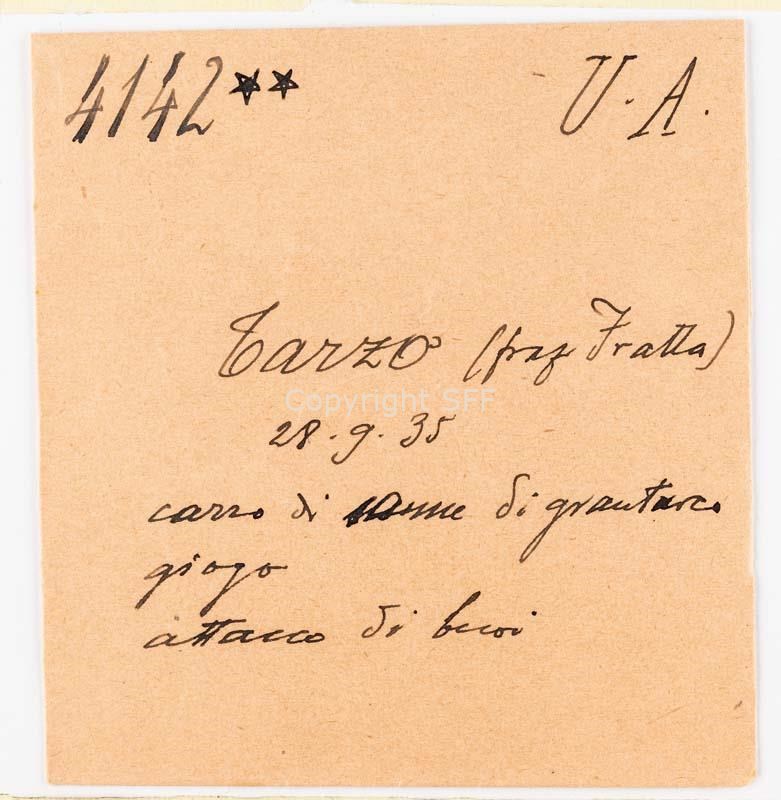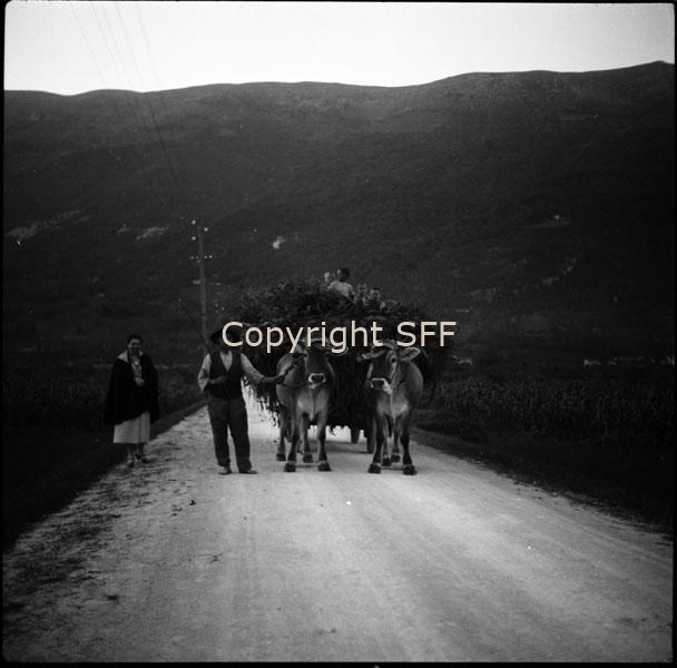 Carro carico di canne di granoturco con bovini aggiogati e famiglia di contadini