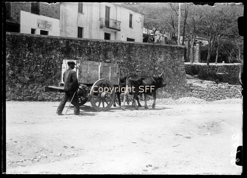 - Carro da carico a due ruote senza sponde laterali trainato da buoi che trasporta una grande cassa