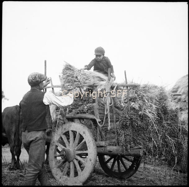 Carro da carico a due ruote con sponde laterali; il carico in questo caso è d'orzo