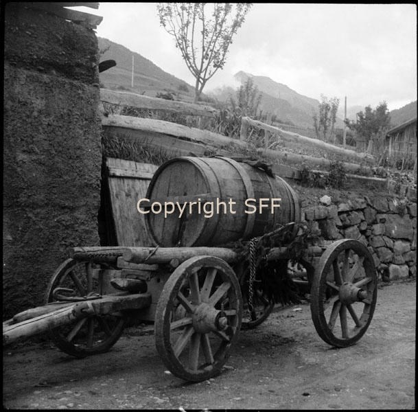 Carro da carico a quattro ruote; sul piano da carico botte contenente concime liquido recuperato dalle latrine