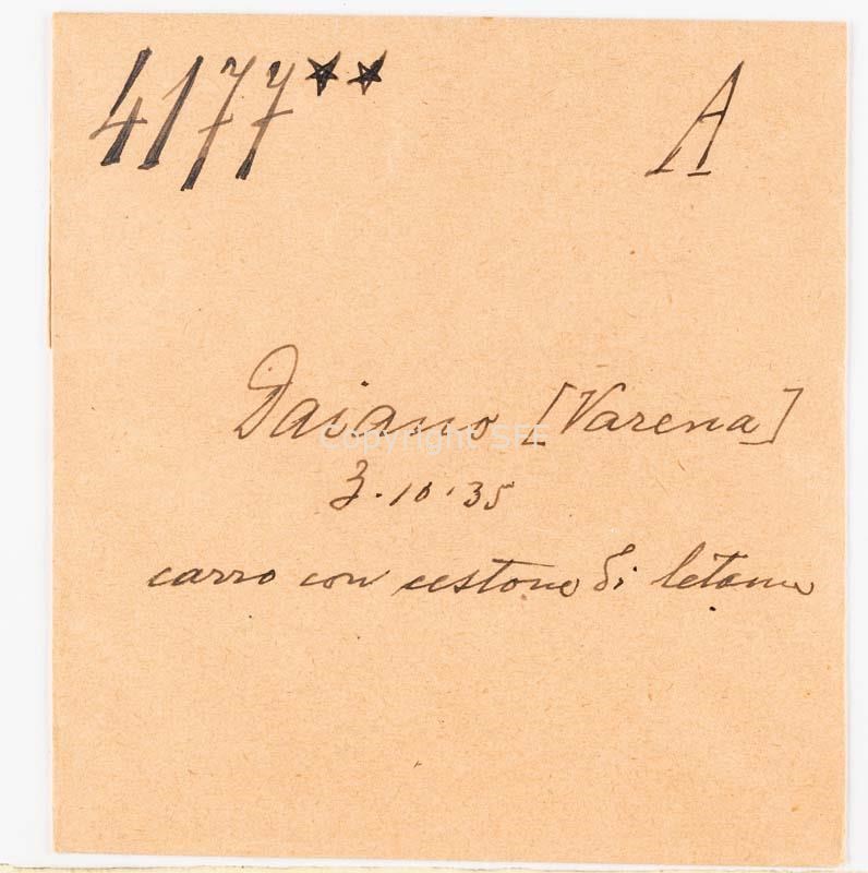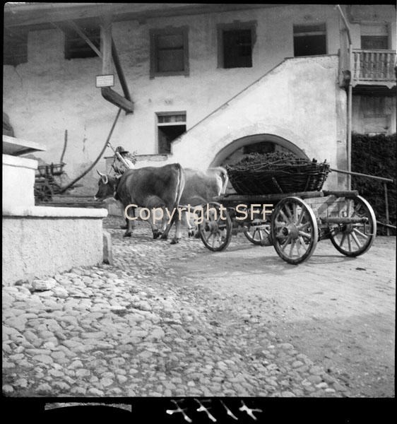 Carro da carico a quattro ruote trainato da buoi; cesto di vimini con contenuto di letame sul piano da carico