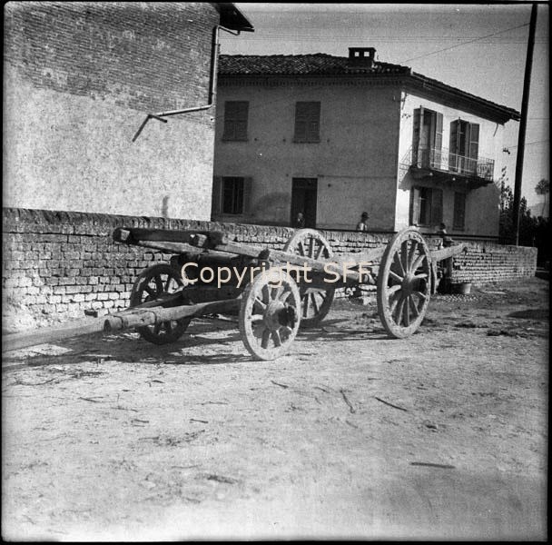 Carro da carico a quattro ruote con stanghe sul piano di carico utilizzate per caricare il cassone contenente l'uva