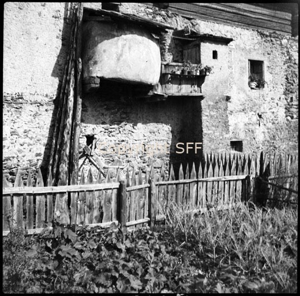 - Casa in muratura con terrazza in legno e forno in muratura sporgente rispetto all'asse della parete
