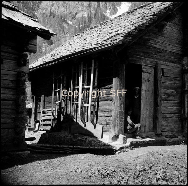 Casa di legno e slitte da fieno