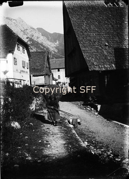 Donna ritratta nelle strade del paese di Collina con una gerla carica e un rastrello