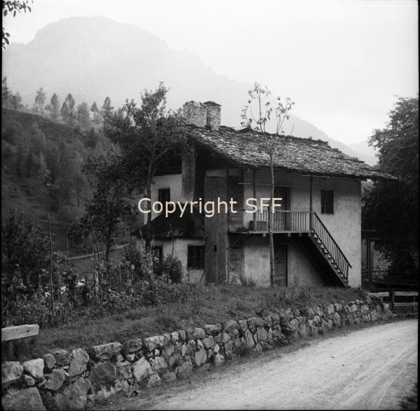 Casa in muratura con ballatoio in legno e copertura di scandole (assicelle in legno)