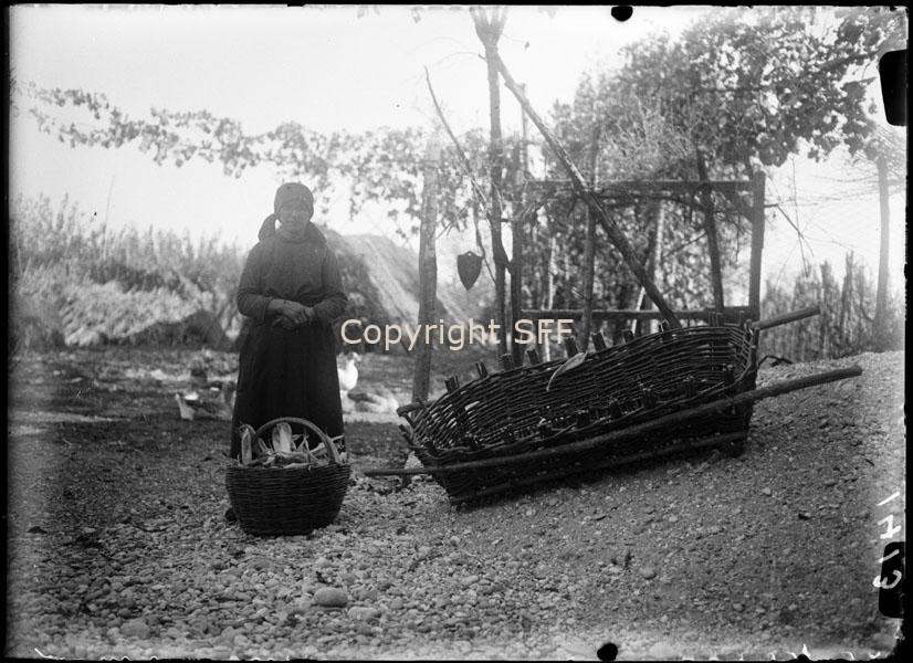 Un'informatrice ritratta accanto ad un paniere con delle pannocchie e a un cestone di vimini. Il cestone, o cesto da carro, ha una capacità di circa mezzo metro cubo, se ne possono posizionare due o addirittura tre su un carro per trasportare pannocchie, terra, concime.