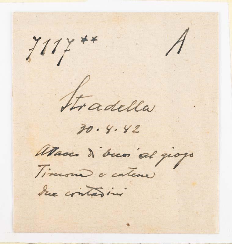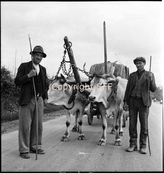 Contadini in posa con bovini aggiogati: attacco, timone e catena