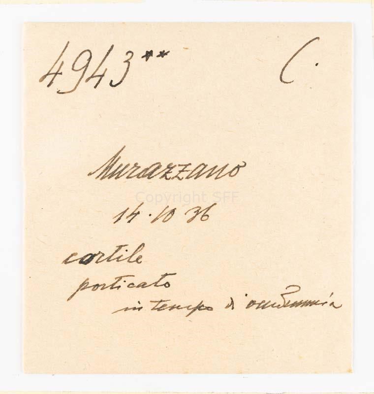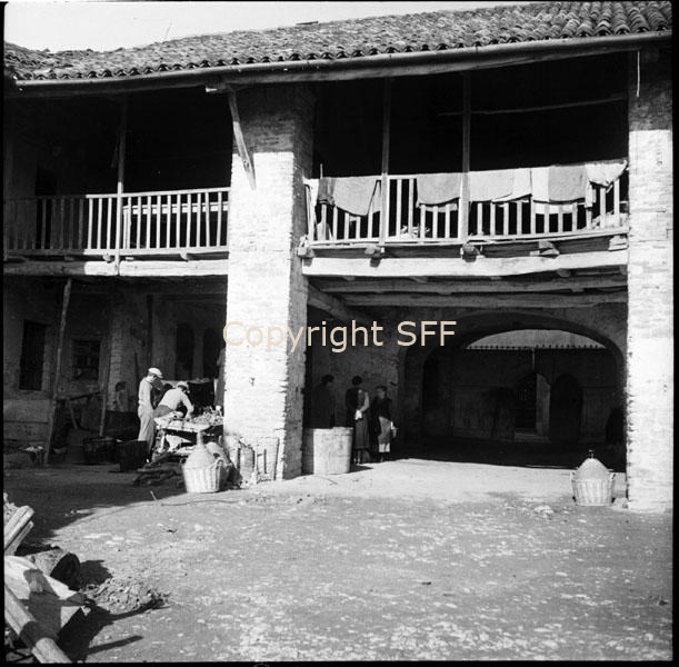 Cortile a Murazzano in tempo di vendemmia: particolare del porticato