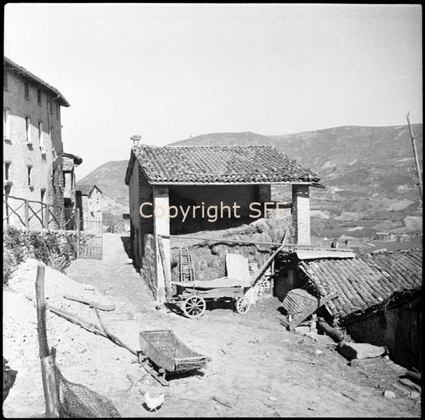 Cortile di casa a Pietragavina: slitta, carro e fienile