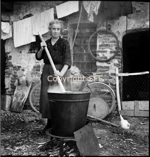 Donna al lavoro con la caldaia da bucato