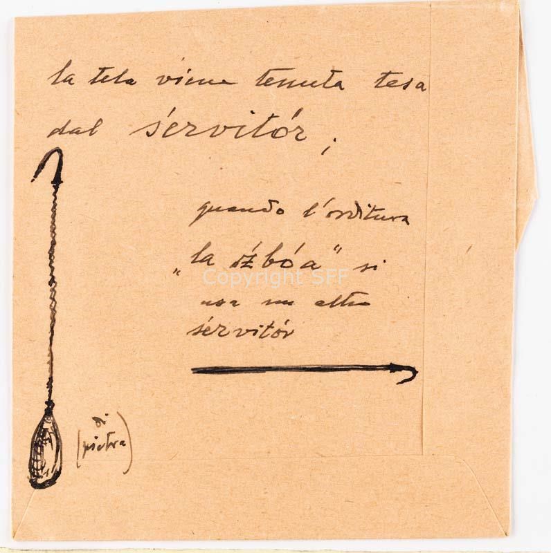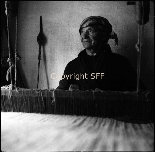 Telaio in legno; particolare dei licci. Ritratto della tessitrice e appoggiata alla parete rocca per la filatura