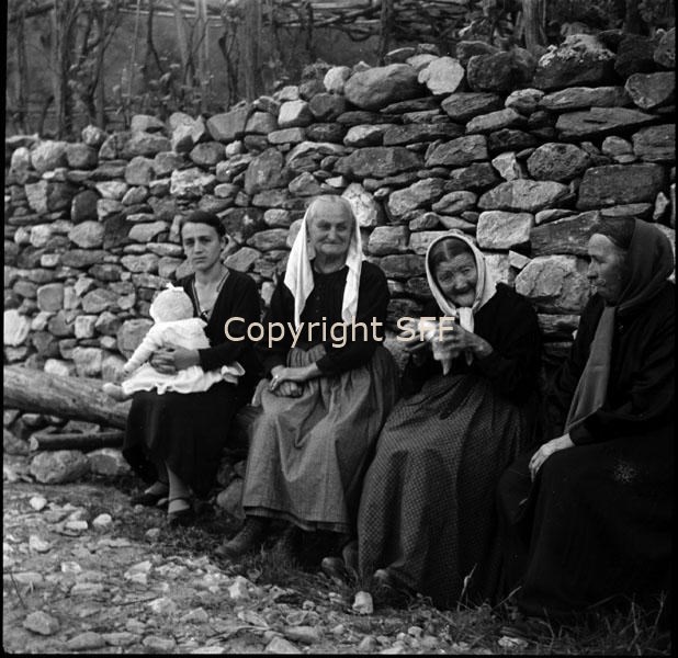 - Ritratto di tre donne anziane che indossano i costumi locali e di una donna più giovane seduta al loro fianco che tiene tra le braccia un bambino molto piccolo