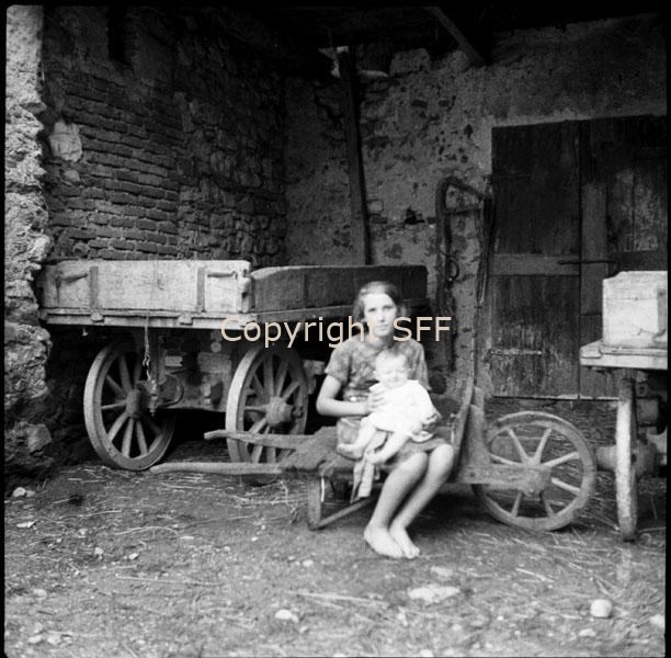 Donna con bambino in posa con carro e carriola