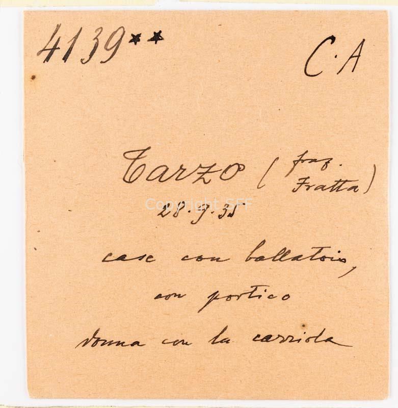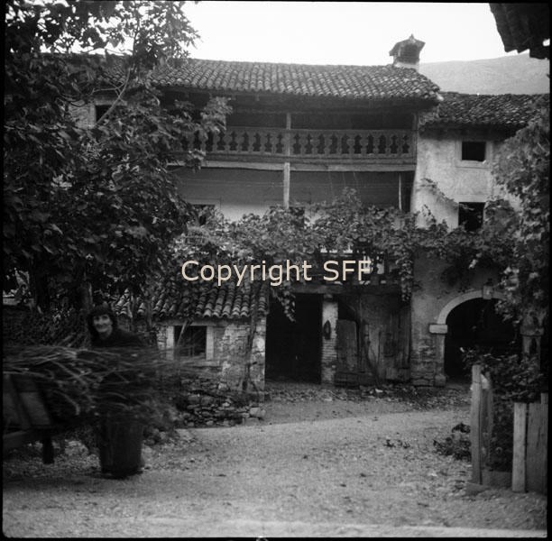 Donna con carriola di fascine davanti a una casa con ballatoio a Fratta di Tarzo