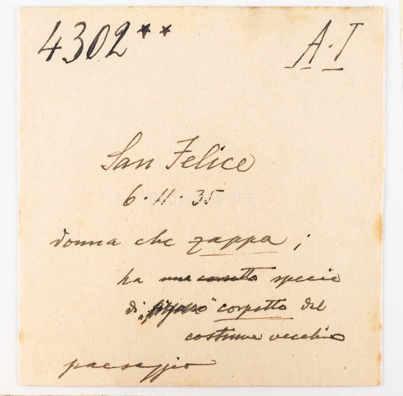 Donna con vesti del costume antico ritratta mentre zappa: sullo sfondo la chiesa del paese