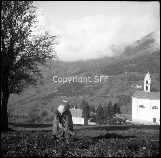 Ritratto di donna che zappa e sullo sfondo chiesa di campagna