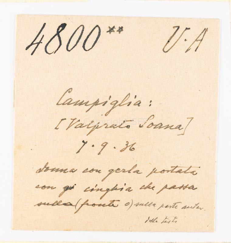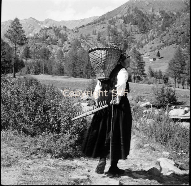 Donna di spalle con gerla e rastrello