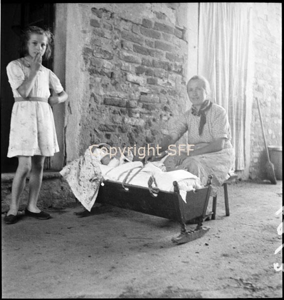 Donna e bambina accanto a una culla