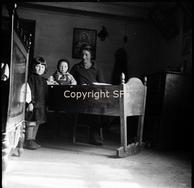 Donna e bambini in posa attorno a una culla in legno