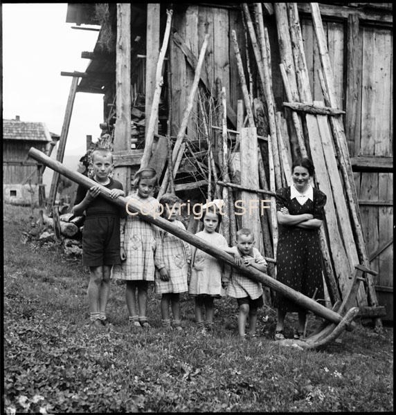 Donna e bambini in posa con un aratro ripreso di fianco
