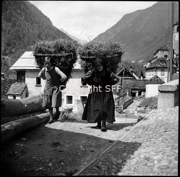 Donna e ragazza in cammino con gerle di fieno sulle spalle
