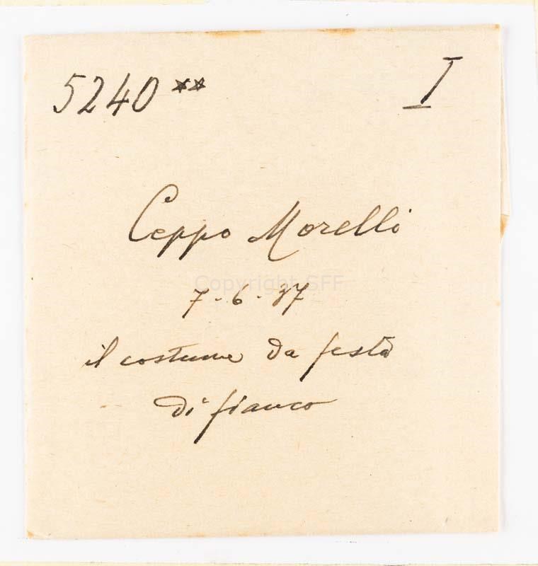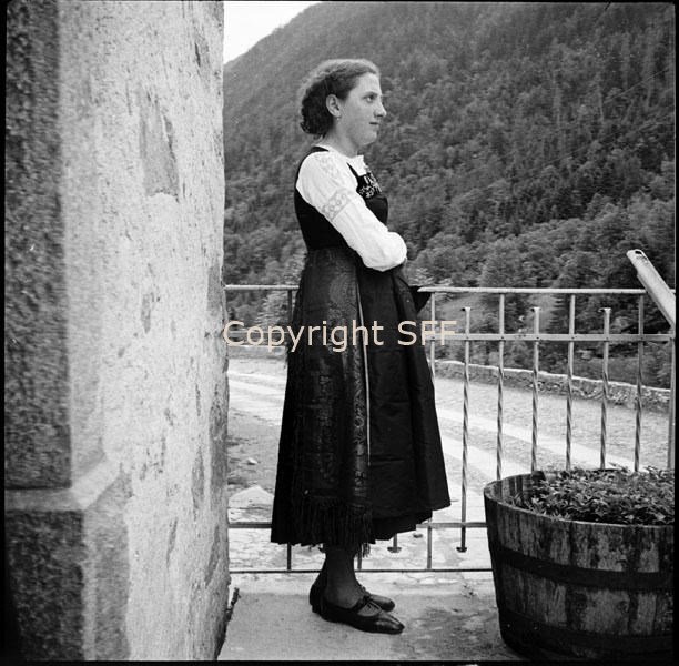Donna in costume festivo a Ceppo Morelli: ripresa di fianco