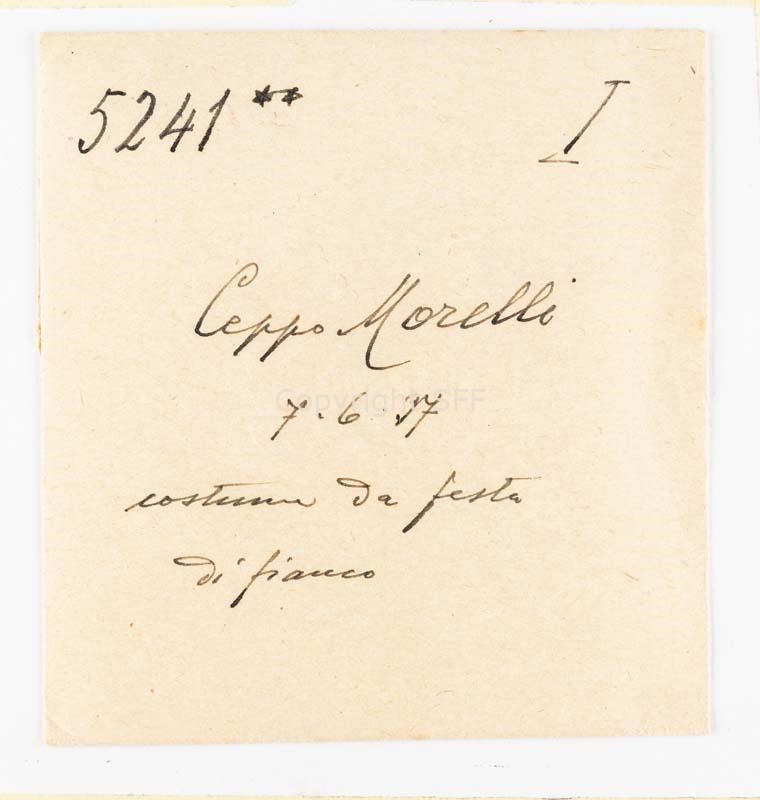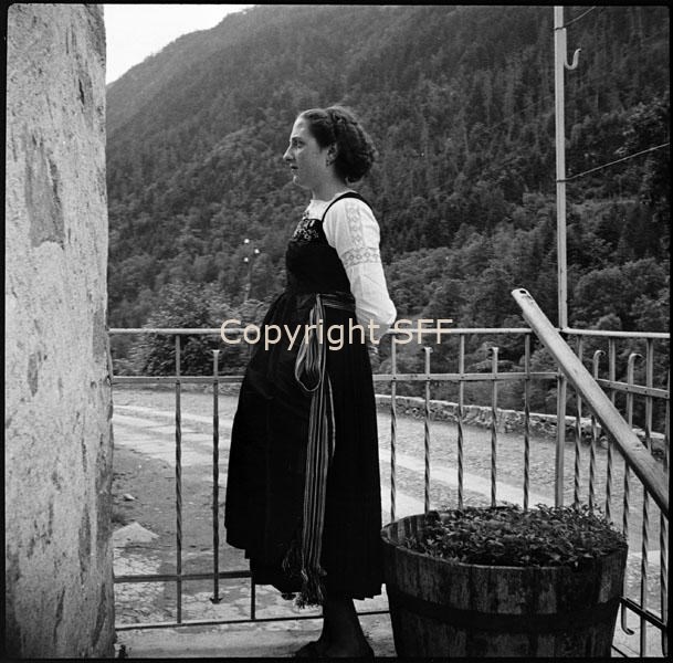 Donna in costume festivo a Ceppo Morelli: ripresa di fianco