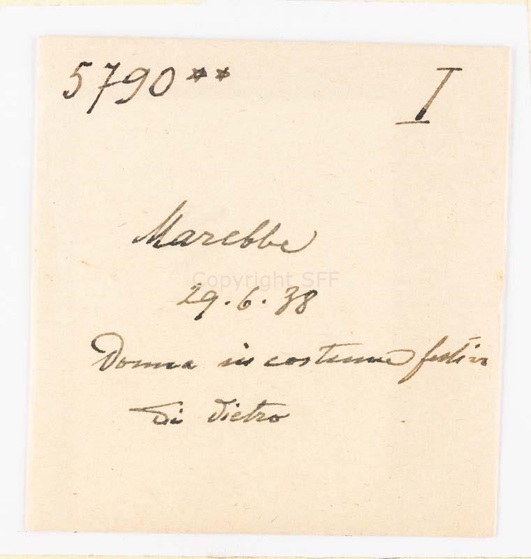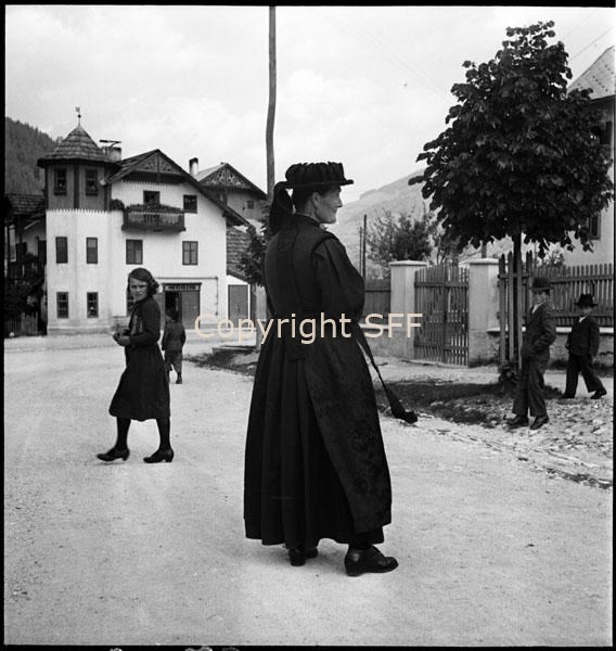 Donna in costume festivo a Marebbe ripresa di spalle