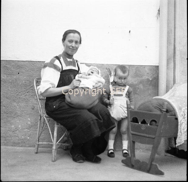 Donna in costume in posa con due bambini accanto a una culla