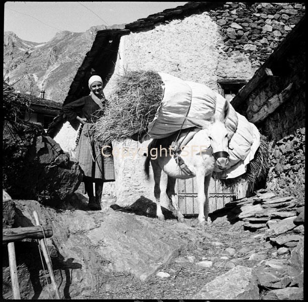 Donna in posa accanto a un carico di segale nel lenzuolo condotto a dorso di mulo