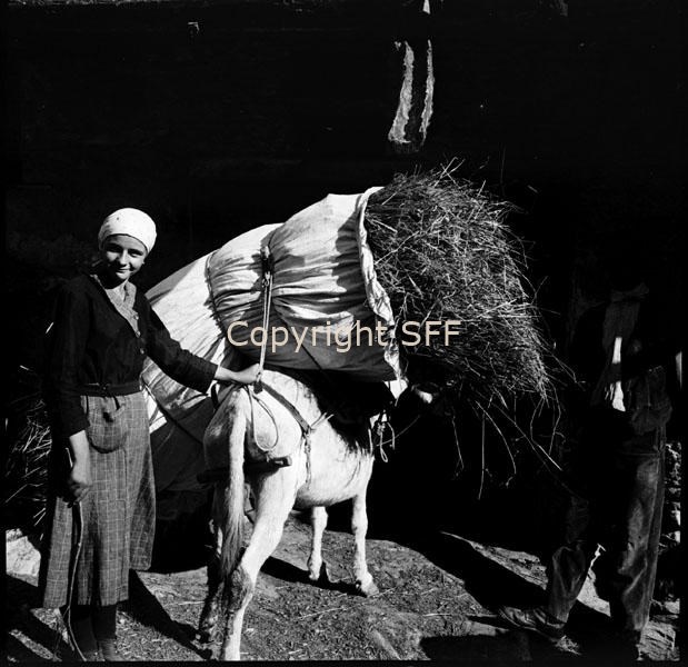 Donna in posa accanto a un carico di segale nel lenzuolo condotto a dorso di mulo: ripresa da tergo