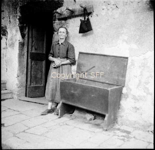 Donna in posa accanto a una madia aperta