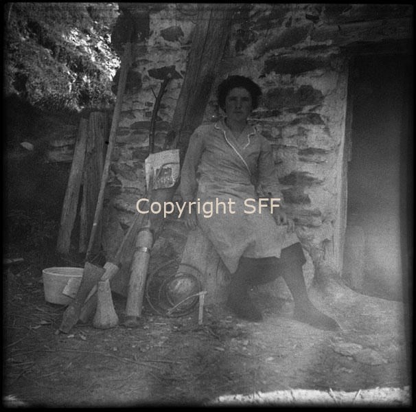 Donna in posa accanto agli attrezzi del laveggiaio
