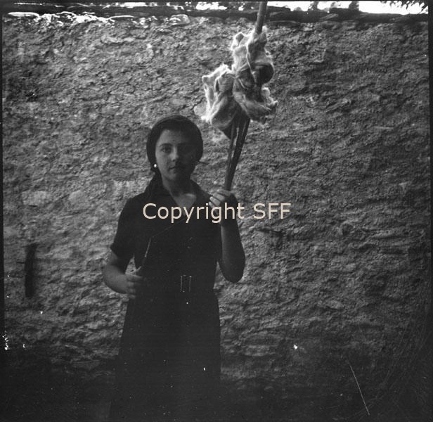Donna in posa con fuso e rocca