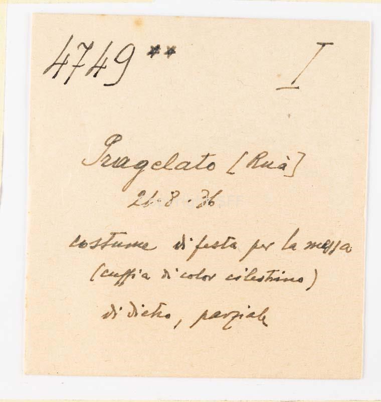 - Ritratto di donna che indossa il costume locale festivo ripreso da dietro; la cuffia è color celeste tenue