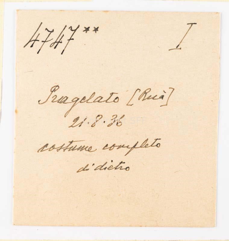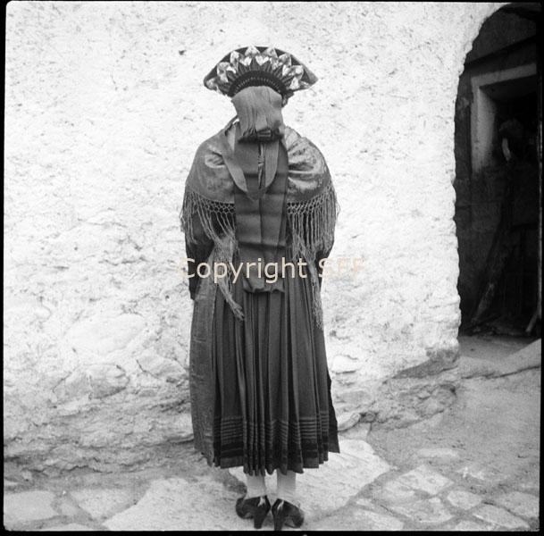 - Ritratto di donna che indossa il costume locale ripreso da dietro: cuffia, fazzoletto da collo, grembiule, nastro, gonna