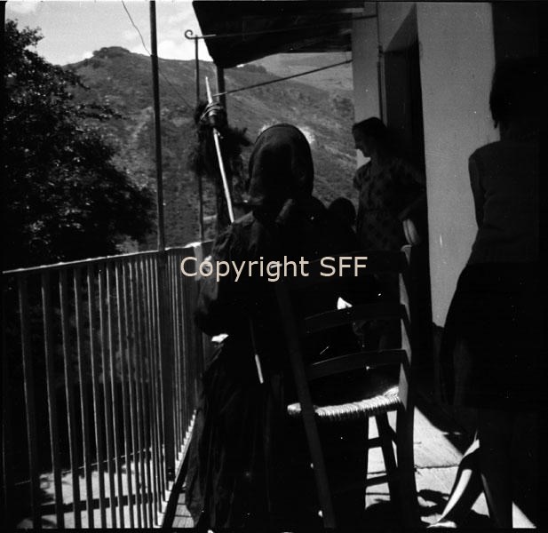 Donna in posa con la rocca: la filatura (ripresa di spalle)