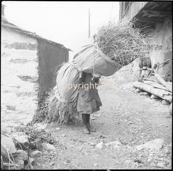 Ritratto di donna che porta sulle spalle un carico di fieno avvolto in un lenzuolo