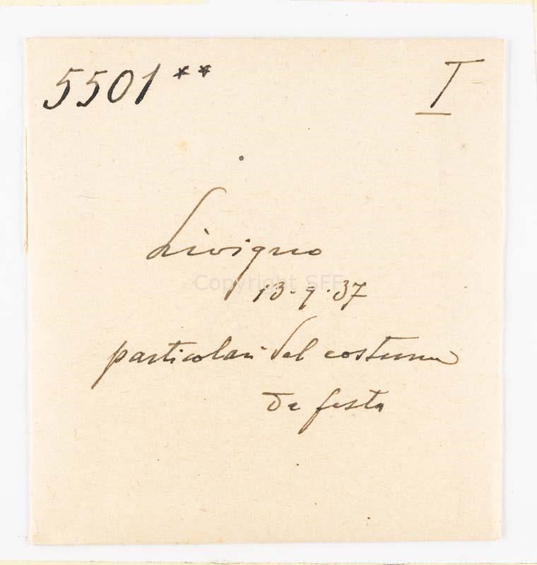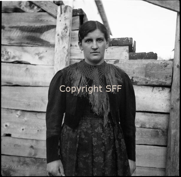 Donna in posa in costume festivo a Livigno: particolari dell'abito